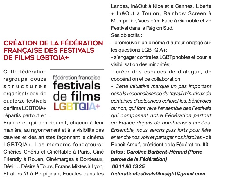 La Fédération Française des Festivals de films LGBTQIA+ est un réseau d’associations engagées pour la diffusion de films LGBTQIA+ en France, au travers du soutien de l’action de ses membres, avec des valeurs de solidarité et de partage.